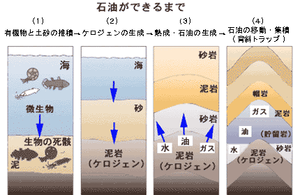 石油は、数億年前の生物の死骸が化学変化を起こしてできた化石燃料といわれています。石油の成因については、長い間「有機(生物)起源説」と「無機(無生物)起源説」の両論が主張されていましたが、現在ではほぼ、有機説に統一されており、その中でも「ケロジェン起源説」が有力です。この説では、生物の死骸が海底や湖底に堆積し、その大部分が化石化してケロジェンと呼ばれる物質になり、長い間に地熱と地圧の影響を受け熟成されて石油に変化したとされています。