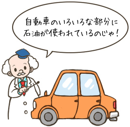 燃料のガソリンや軽油、エンジンやAT(オートマチックトランスミッション)などを滑らかに動かす潤滑油、プラスチックなど部品の原料、タイヤのゴムや塗料の原料など。 |