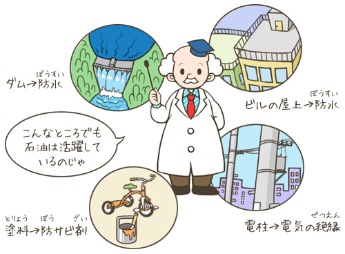 道路は、暮らしや産業を支え、国民生活の向上に大きく寄与しています。道路を整備するためには、ガソリン税など石油諸税が財源として使われていますが、道路自体を建設するためには、石油製品の一つであるアスファルトが欠かせません。日本では、一年間に約330万トンのアスファルトが消費されています。その約70%は道路用ですが、そのほか、空港の滑走路、ビルやダムの防水などにも使われているのです。 |